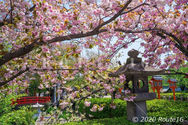 参道は桜のトンネルになっていています。参道の両脇に立つ燈籠の朱色と桜のピンクが何とも美しい。